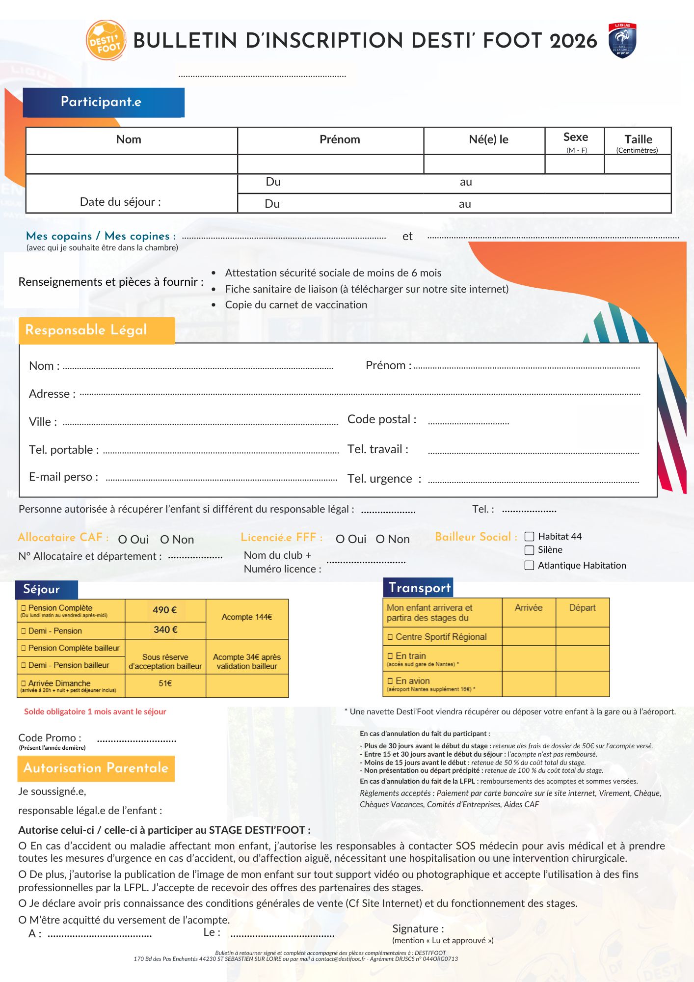 Pour les inscriptions par un des bailleurs suivants : Habitat 44, Atlantique Habitation ou Silène, merci de saisir votre pré-inscription en ligne et de nous adresser un mail à contact@destifoot.fr – en nous précisant les NOM et PRÉNOM de enfant et la semaine souhaitée.
